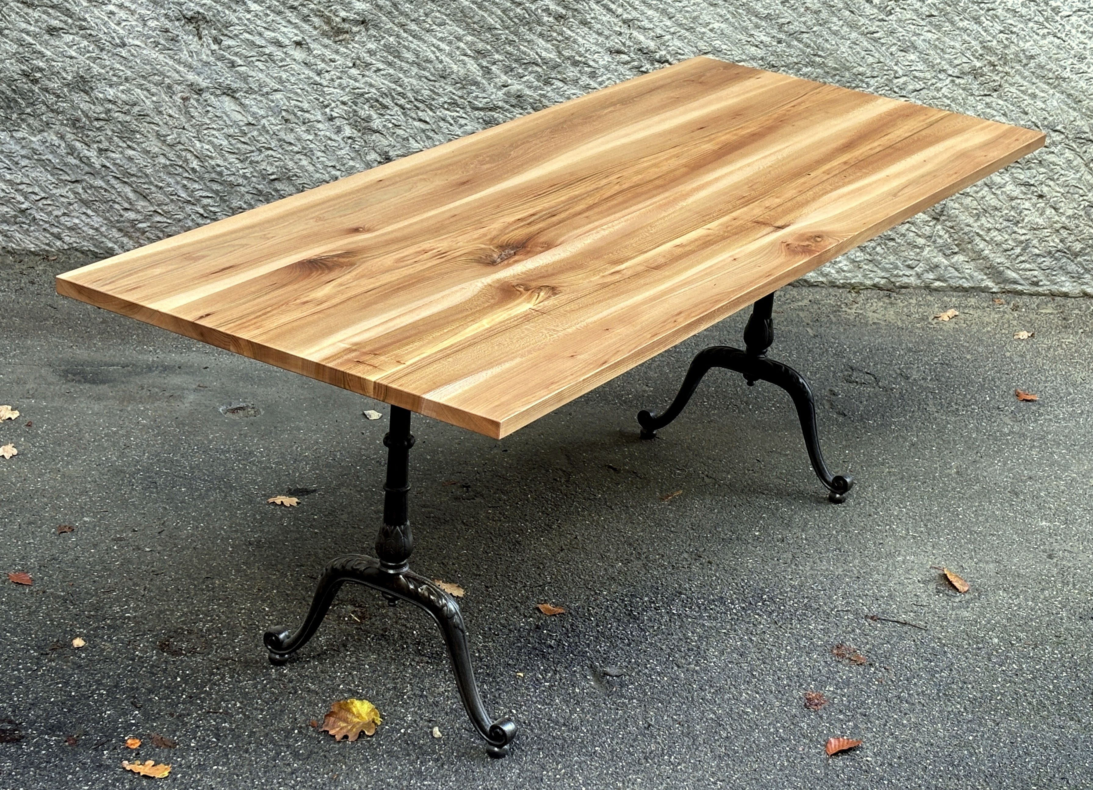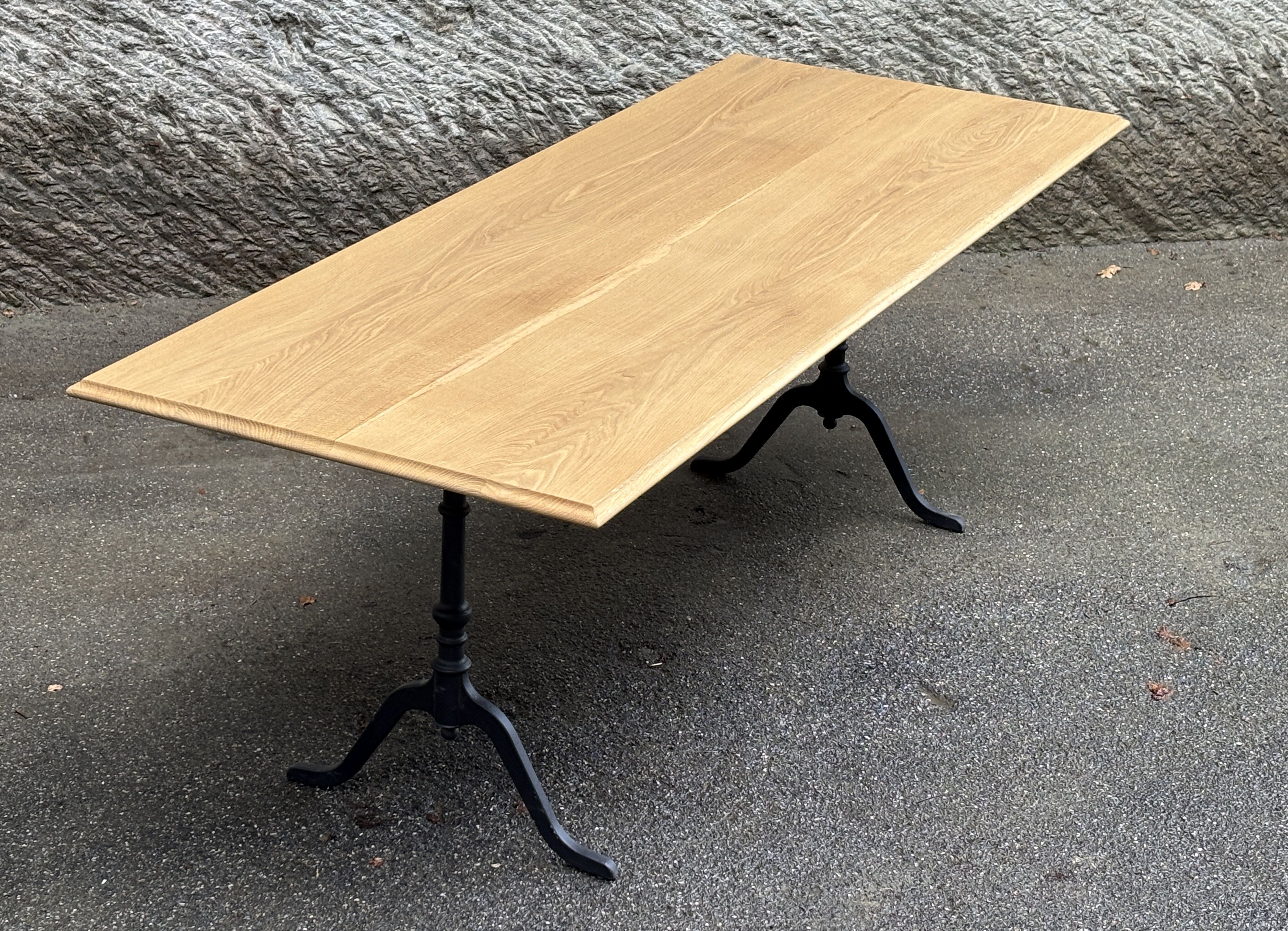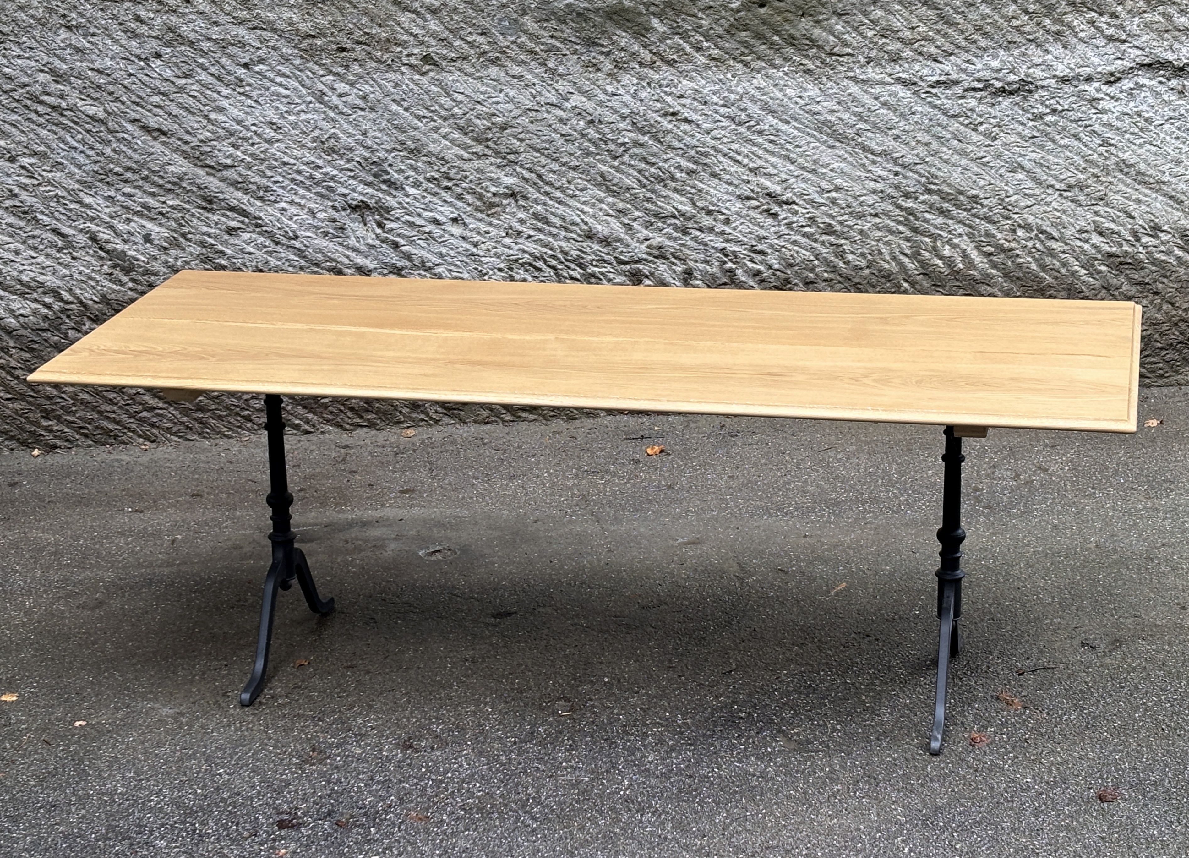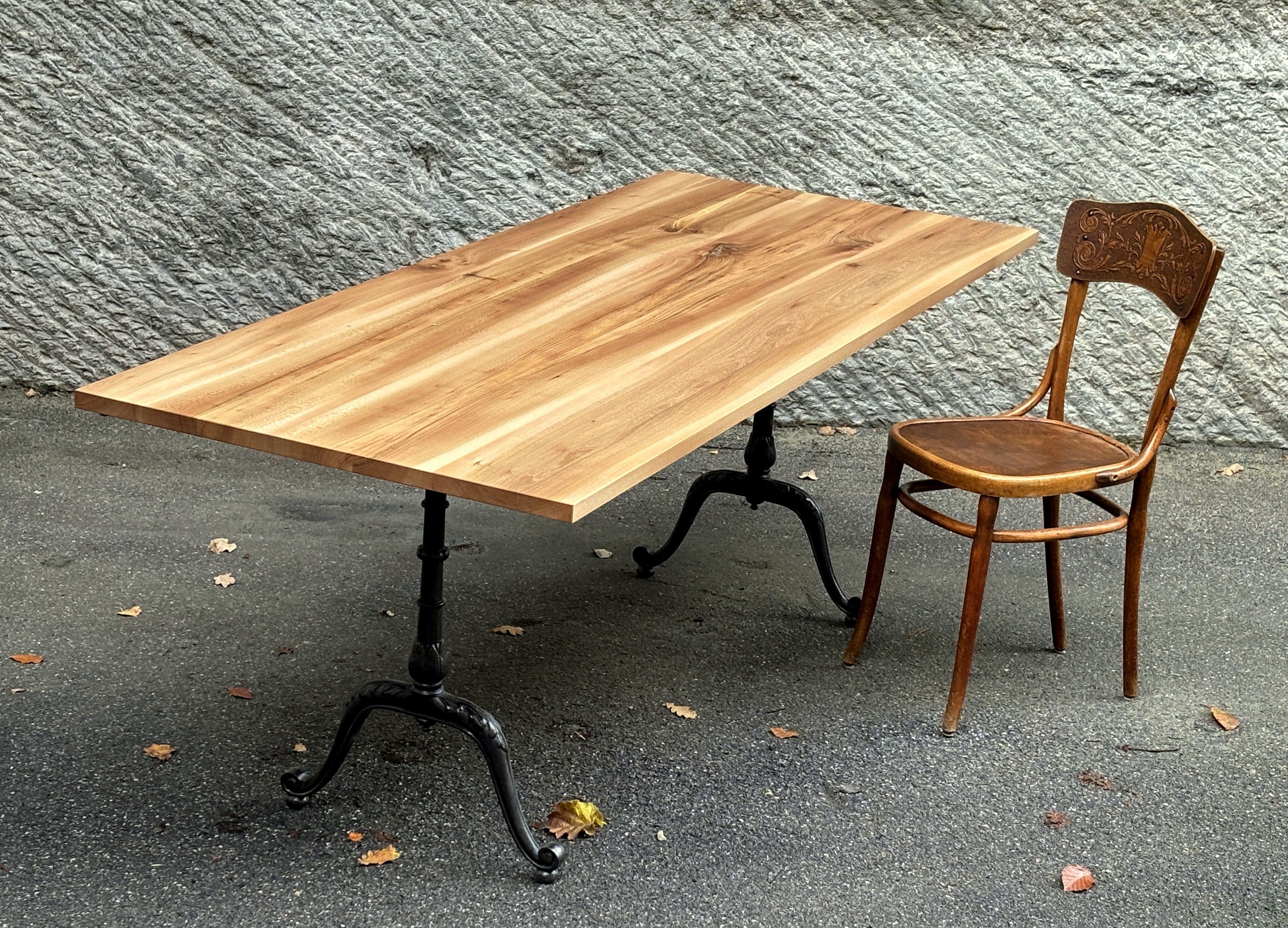 Das ist ein neuwertiger Ausstellungstisch, schlicht und unaufgeregt. Die Platte besteht aus nur vier Brettern, die sich optimal zusammenfügen und ein harmonisches Ganzes ergeben. Sie ist wasserbeständig geölt mit Naturoptik. Die klassischen Gussfüsse sind neu, und zugleich mein letztes Paar der legendären ‘Maurer-Füsse’ aus Lützelflüh.