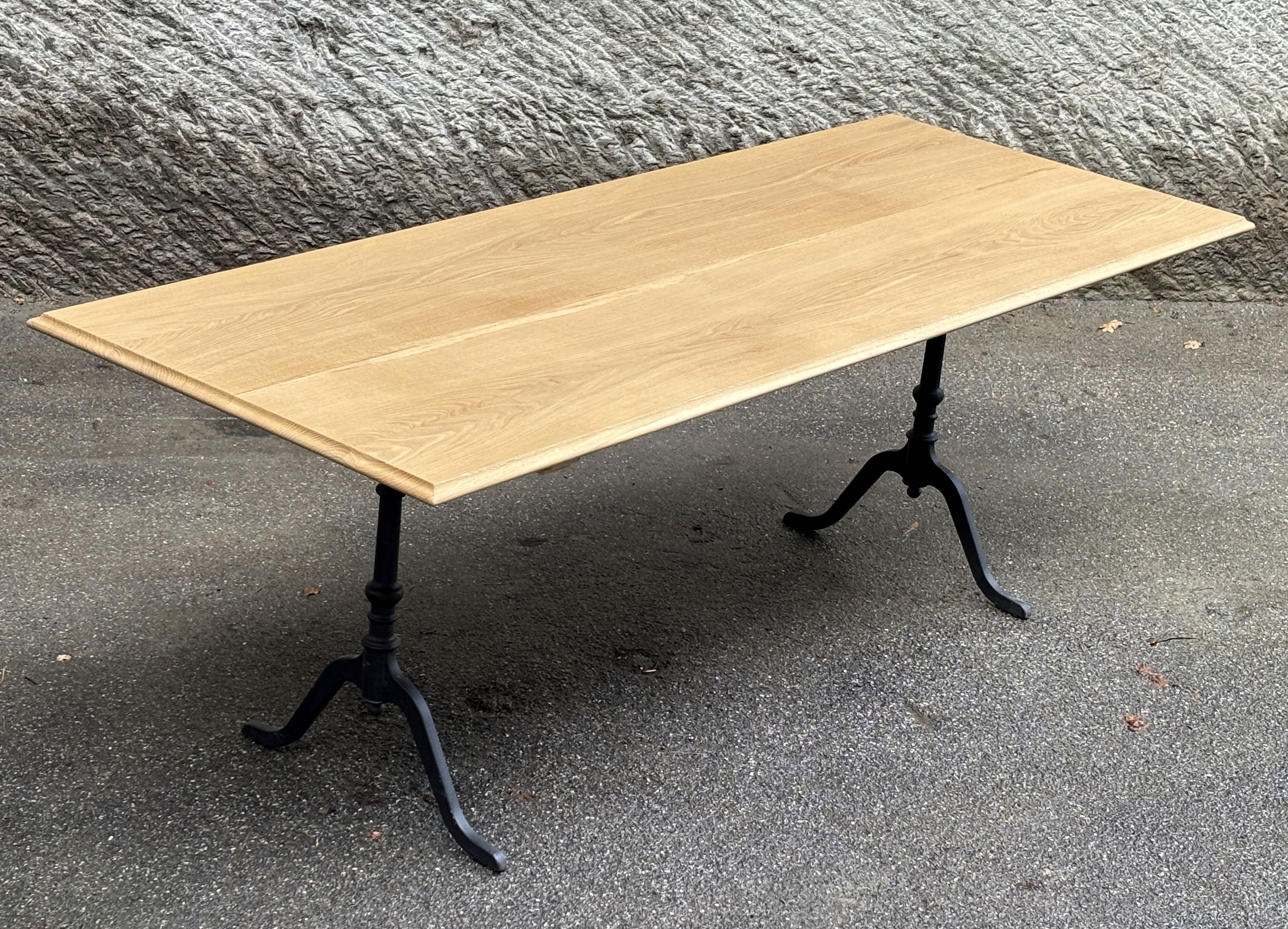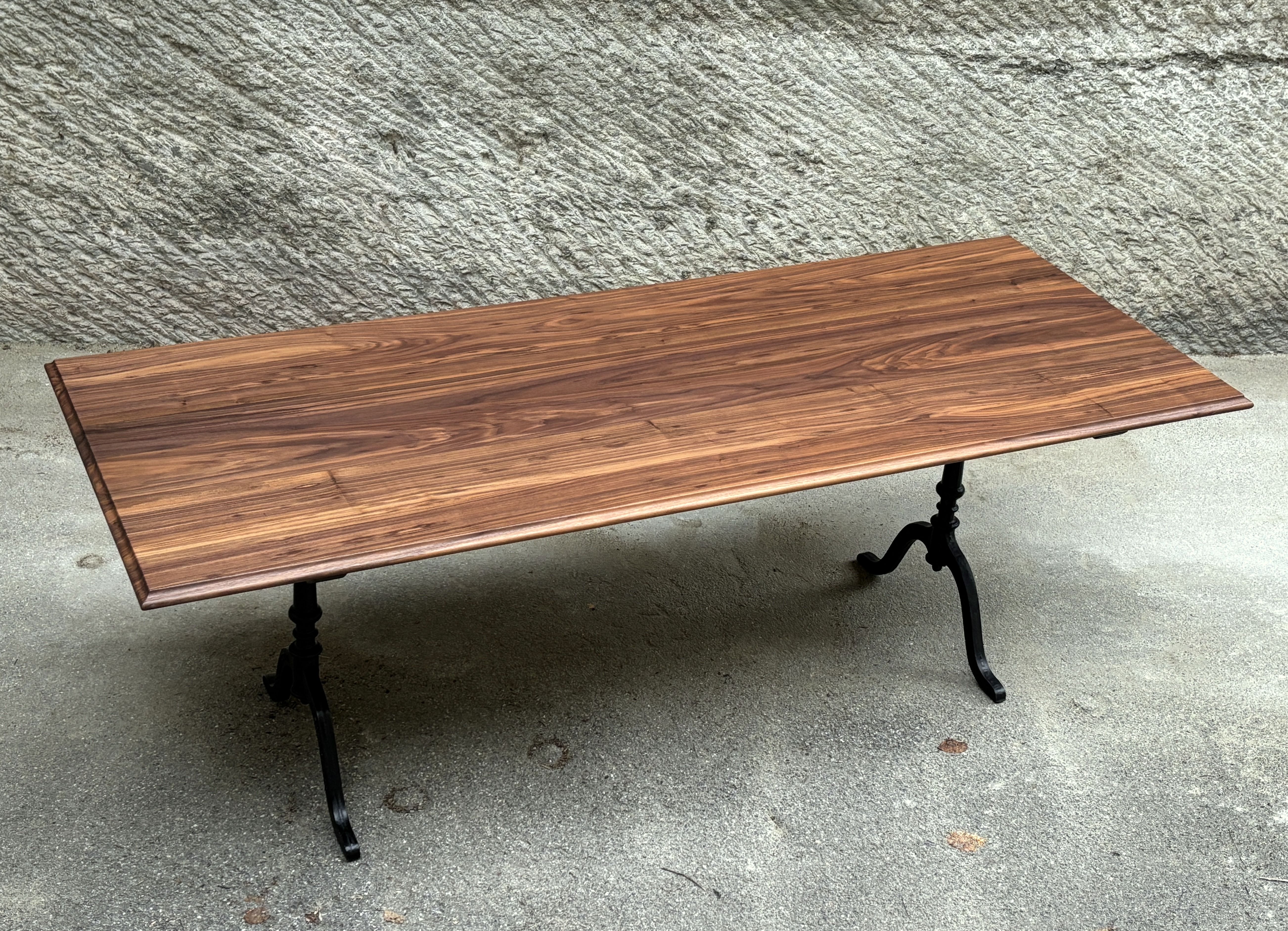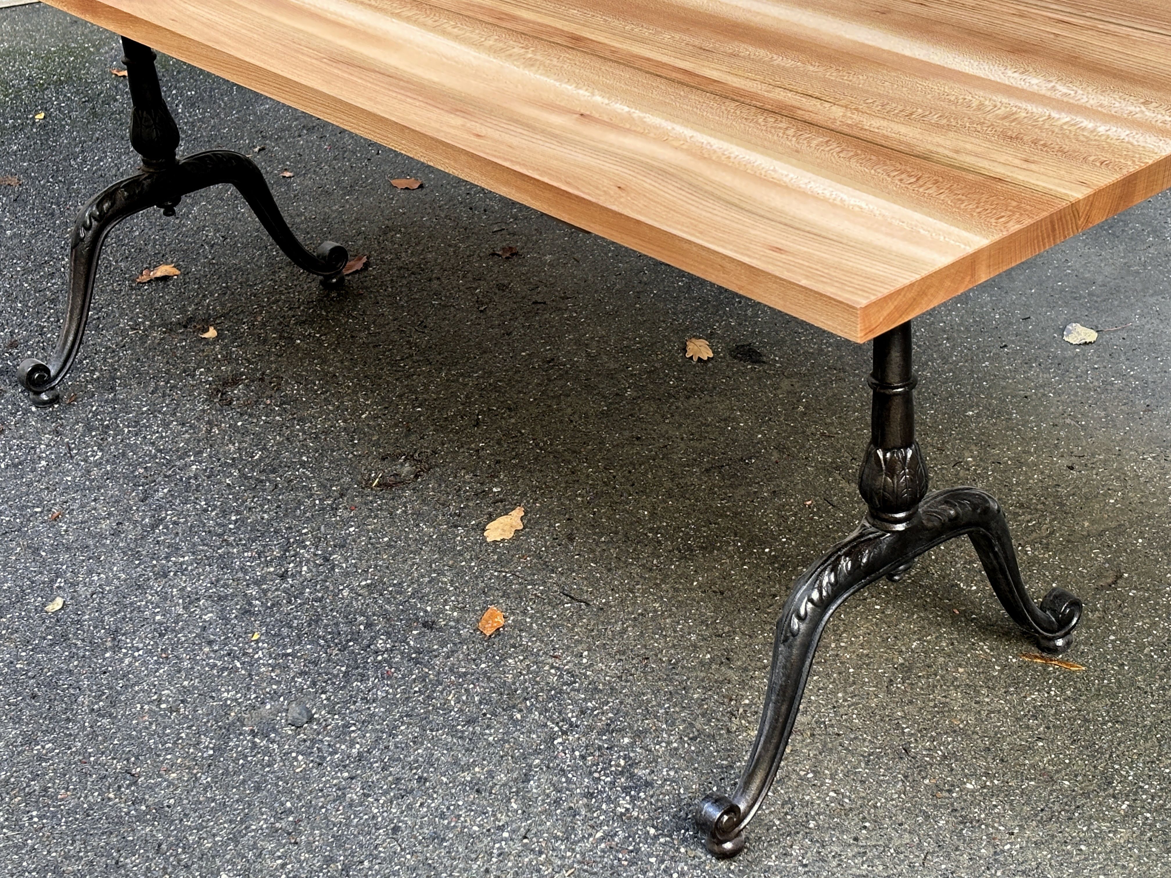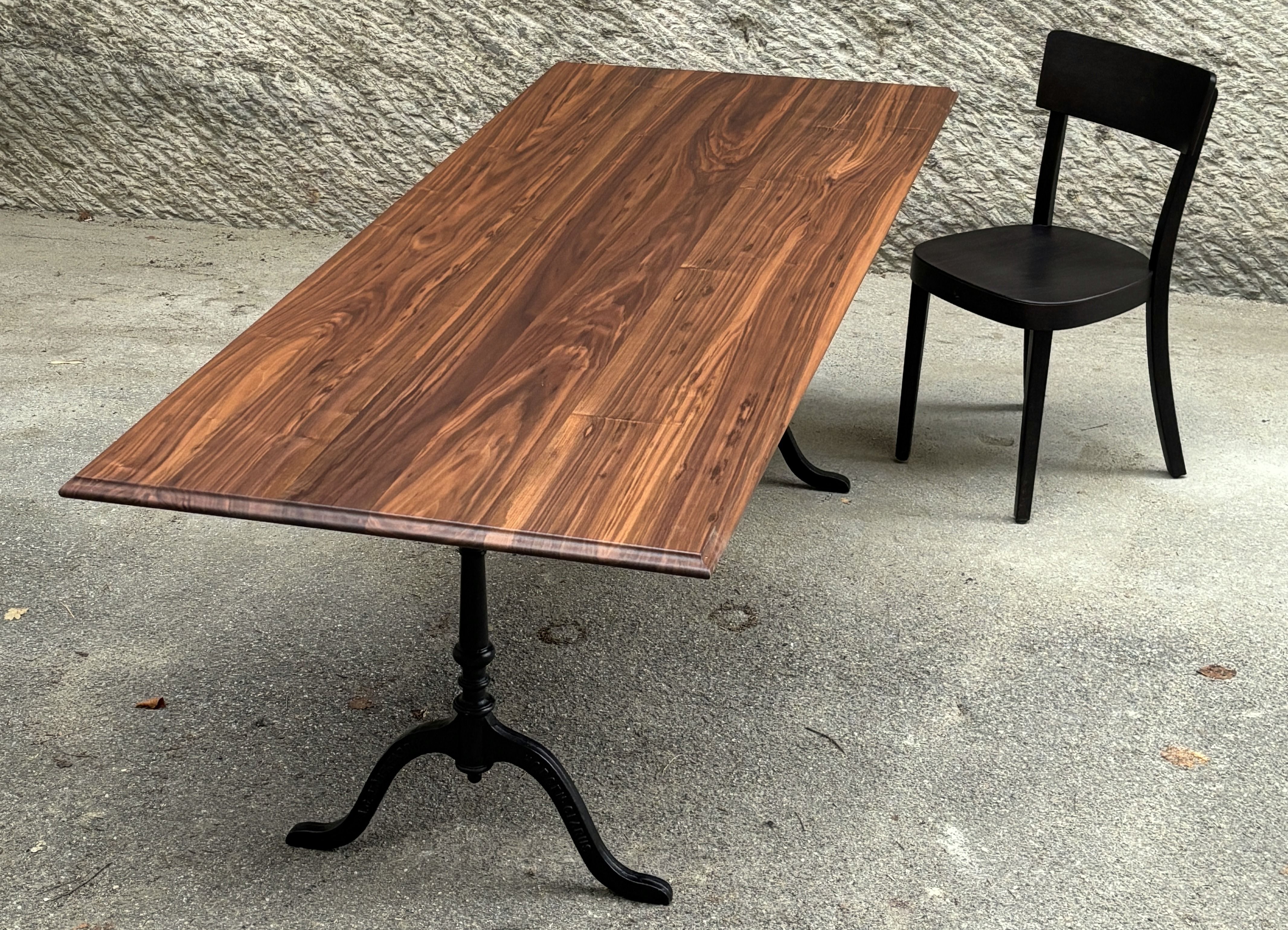 Das ist ein neuwertiger Ausstellungstisch, schlicht und unaufgeregt. Die Platte besteht aus nur vier Brettern, die sich optimal zusammenfügen und ein harmonisches Ganzes ergeben. Sie ist wasserbeständig geölt mit Naturoptik. Die klassischen Gussfüsse sind neu, und zugleich mein letztes Paar der legendären ‘Maurer-Füsse’ aus Lützelflüh.