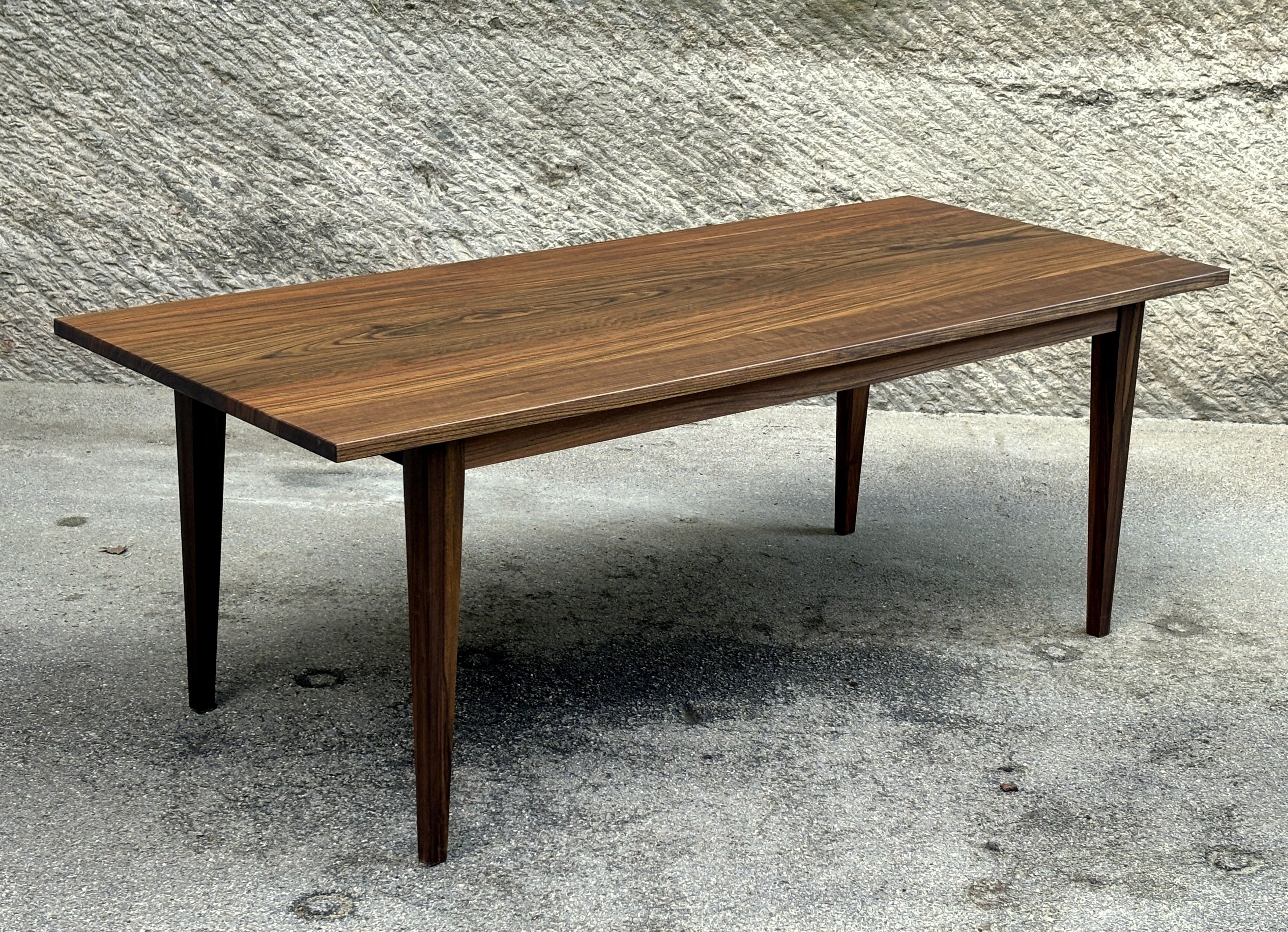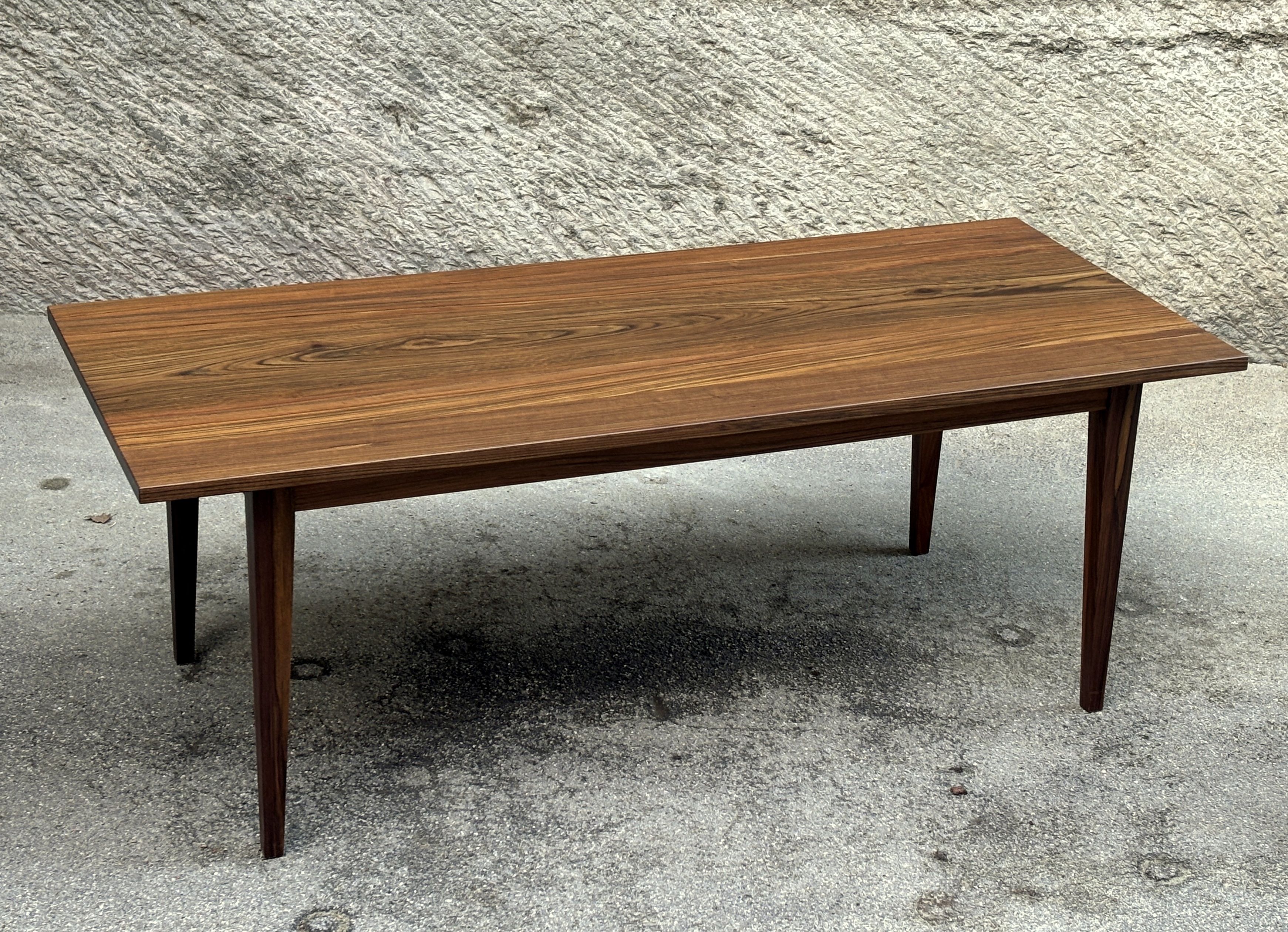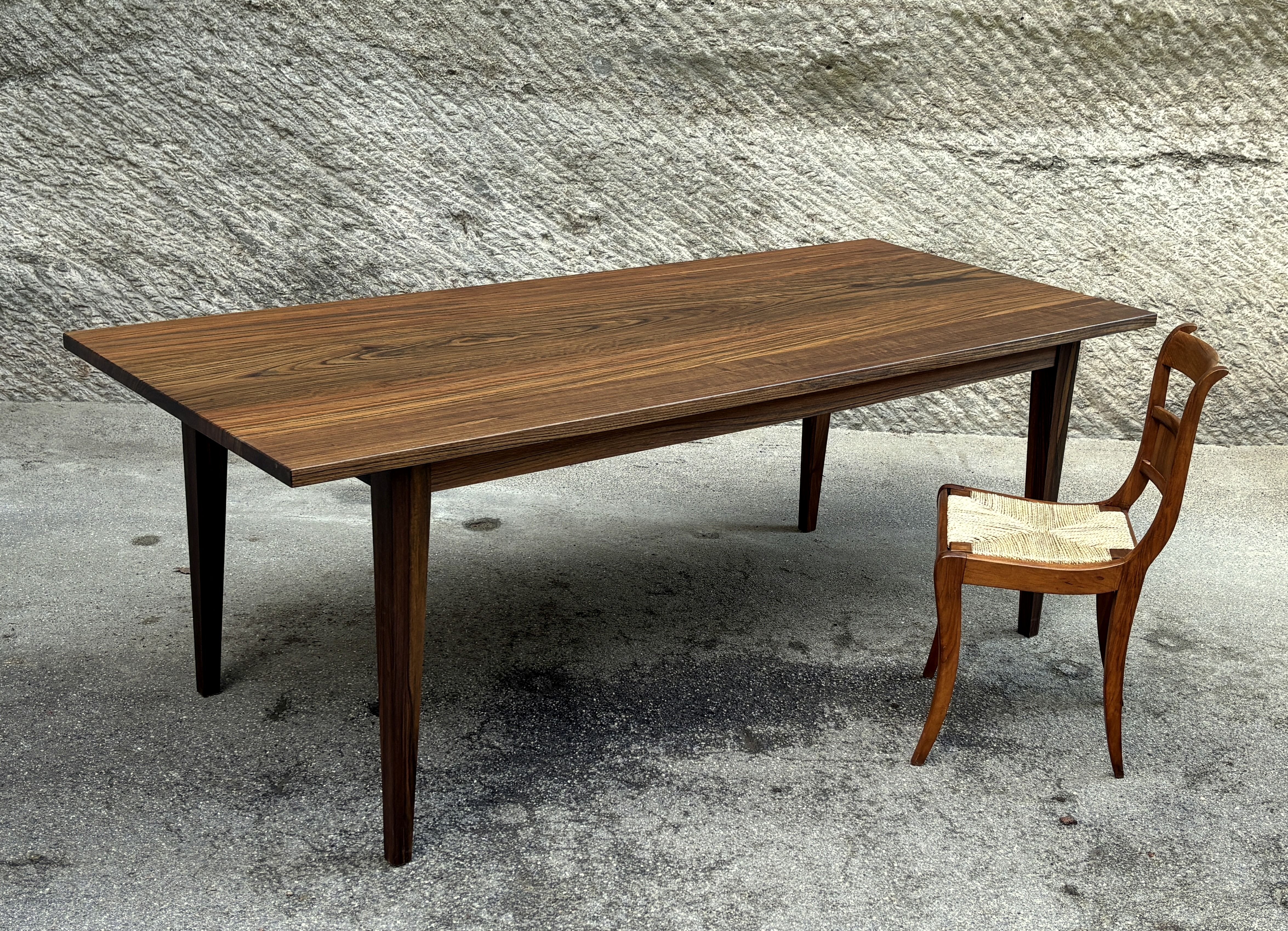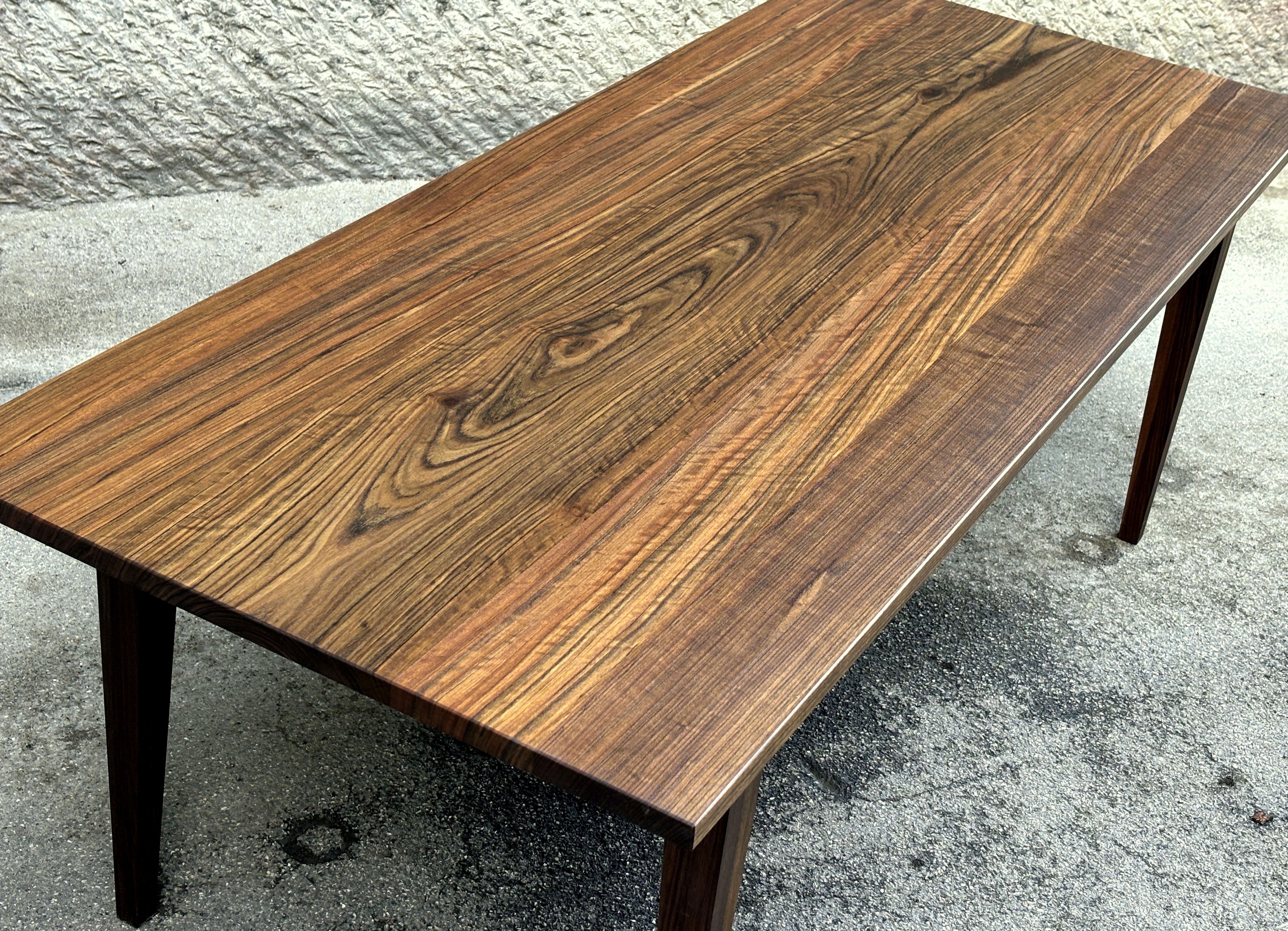 Ein Holz aus Kamerun. Schwer und hart und mit einer enormen Leuchtkraft. Dieses Holz habe ich vor rund 15 Jahren, als zertifizierte, exotische Hölzer propagiert wurden, teuer eingekauft und eingelagert. Seither habe ich dennoch konsequent mit Holz aus unserer Region gearbeitet. Nach Jahren nun habe ich diesen Stamm aus dem Lager geholt und verarbeitet. Die Arbeit hat richtig Freude gemacht und der entstandene Tisch ist einzigartig und äusserst hochwertig.