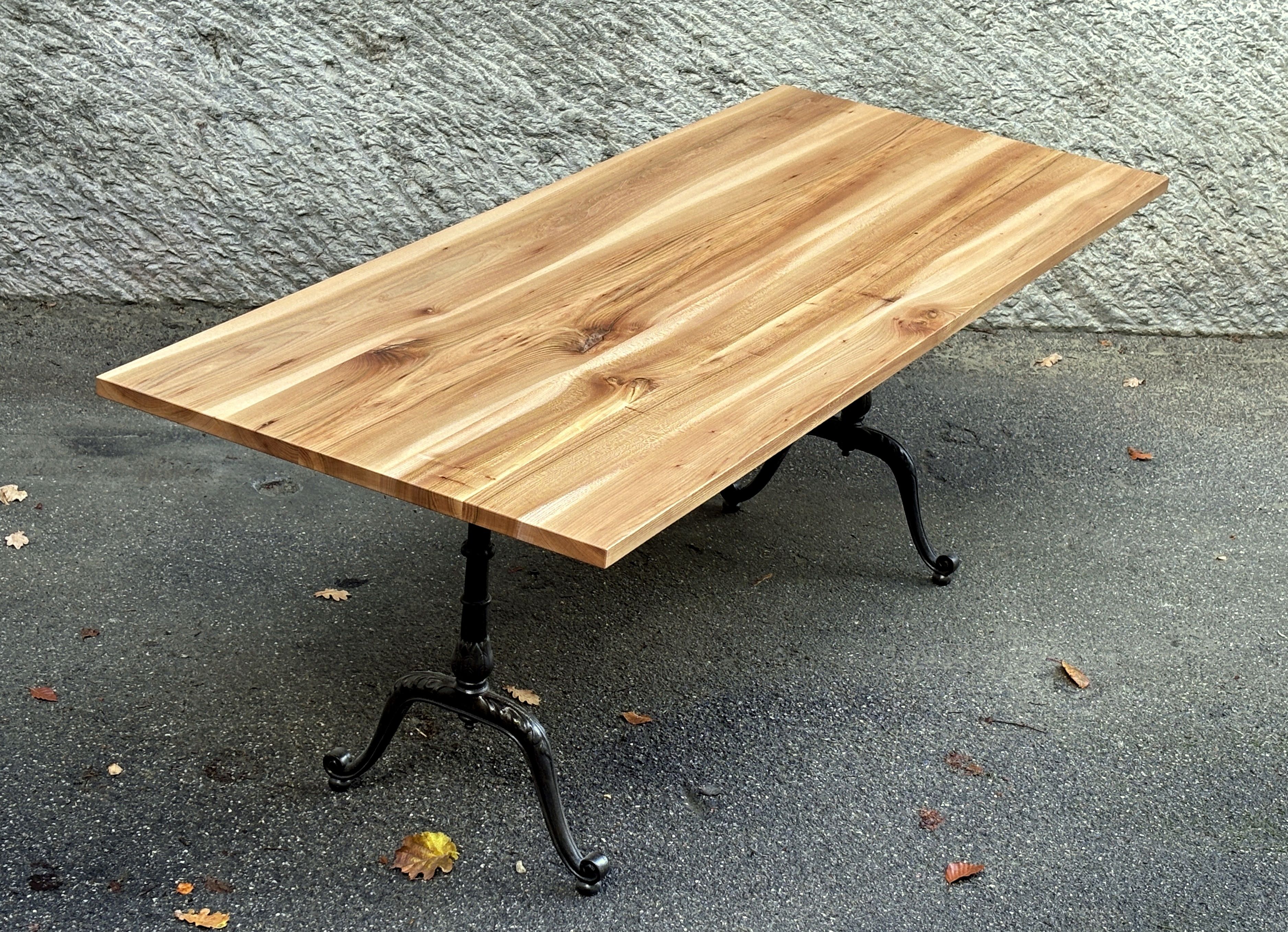 Angefertigt im September 2025, inspiriert durch den Herbst, die Braun-, Rot- und Goldtöne dieses Ulmenholzes und die antiken floralen Gussfüssen. Dieser Tisch trägt die Herbstsonne in sich und sorgt auch im Winter für eine warme Stimmung. Die Oberfläche ist wasserbeständig geölt.